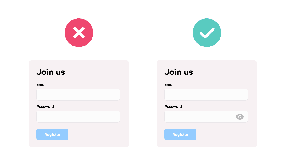 Prevent users from having to delete and re-enter the entire password by using established pattern - eye icon or "Show" label, which will show us the password after clicking on them.